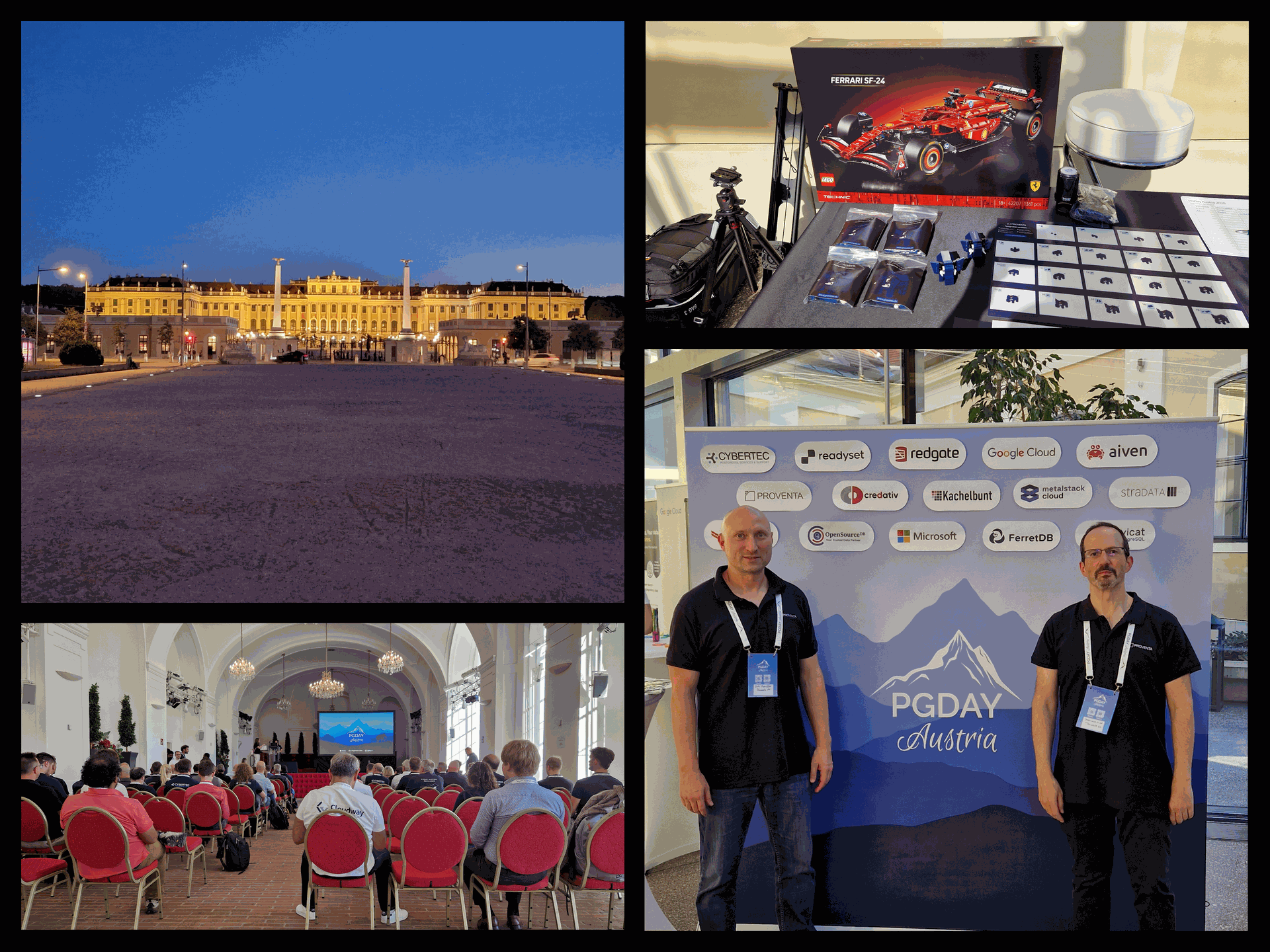 Beyond the technical sessions, PGDay Austria was a vibrant space for networking and community-building. The different present sponsors organized small activities for the community with the chance to win some nice prizes. Proventa AG organized a challenge where attendees had to build a small Lego elefant, consisting of round about 40 pieces. The person who built the elefant the fastest was awarded with a Lego Ferrari set with over 1300 pieces. It was great to see so many people engaging in this challenge and periodically coming back during the day to check their ranking.